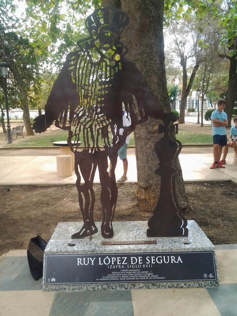 En el centro del parque de la Paz de Zafra, entramos en el “Rincón de Ruy López”, un espacio dedicado por su ciudad y que preside, según nos cuentan, la única estatua dedicada a un ajedrecista en España. La figura de Ruy da paso a un tablero gigante de ajedrez rodeado de doce mesas de piedra para poder practicar el juego.