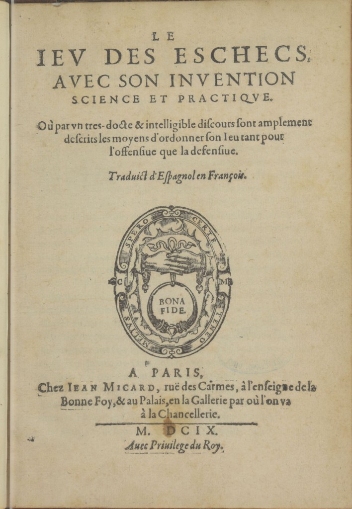 Le Jev des Eschecs, Avec son Invention, Science et Practiqve. Traducción del español al frances del libro de Ruy López. parís 1609. Cleveland Public Library