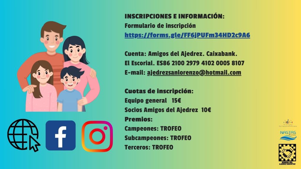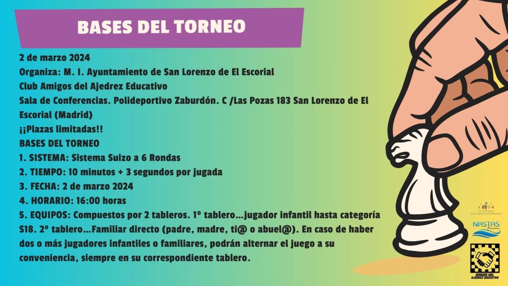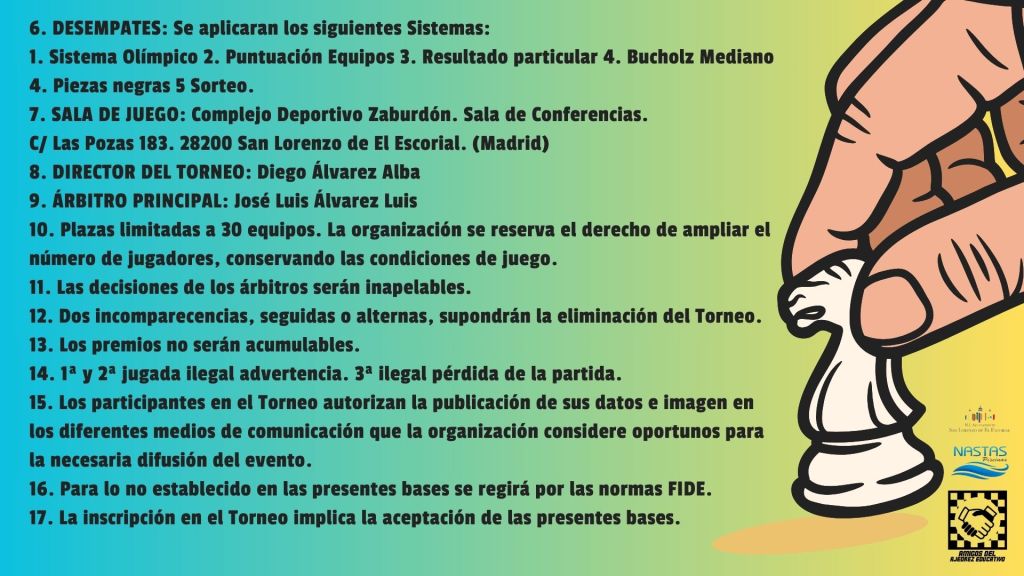 11. Se consideran jugadores locales: empadronados en S.L. El Escorial, socios del Club Amigos del Ajedrez y alumnos de la Escuela y colegios de la localidad.